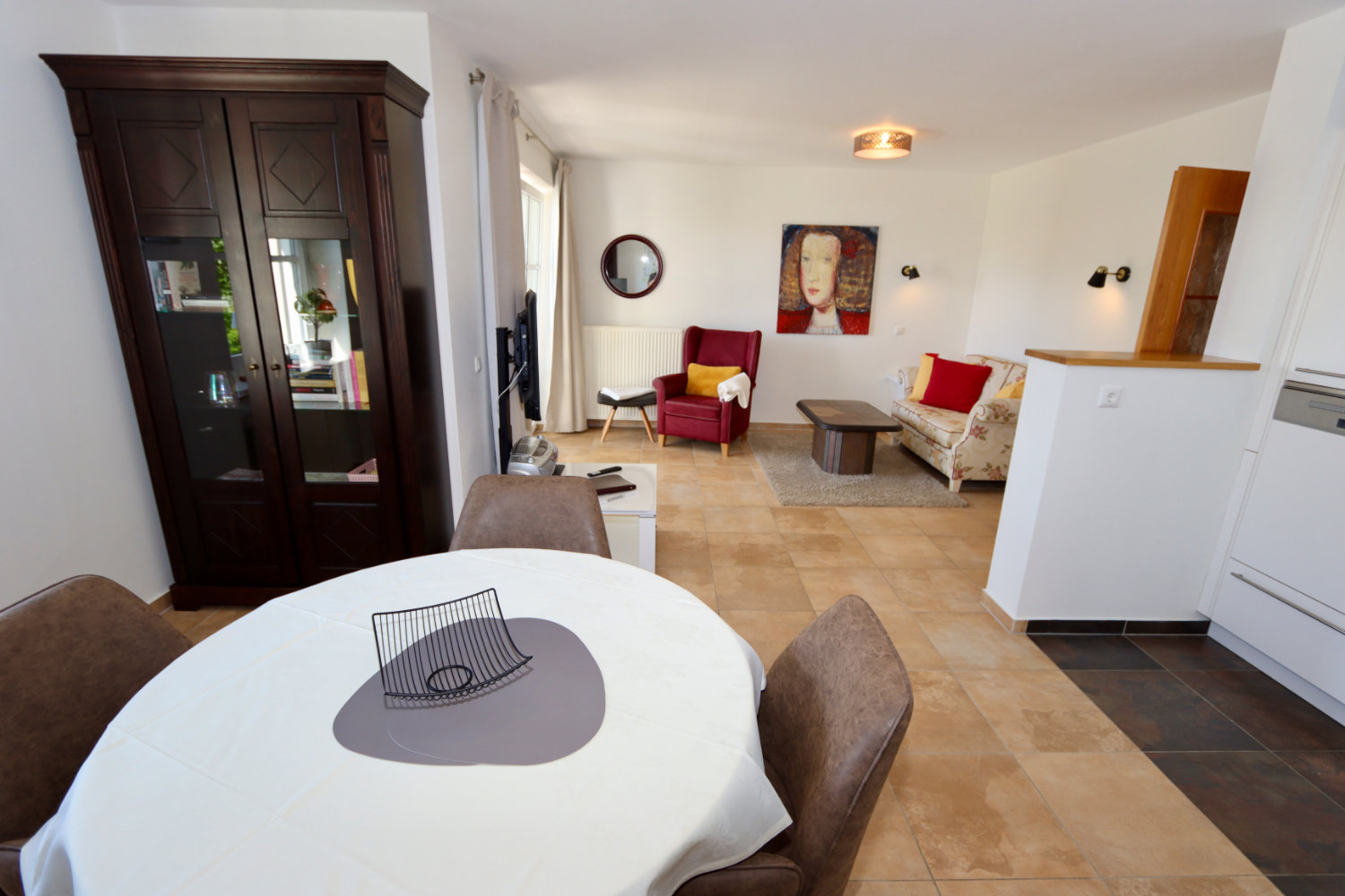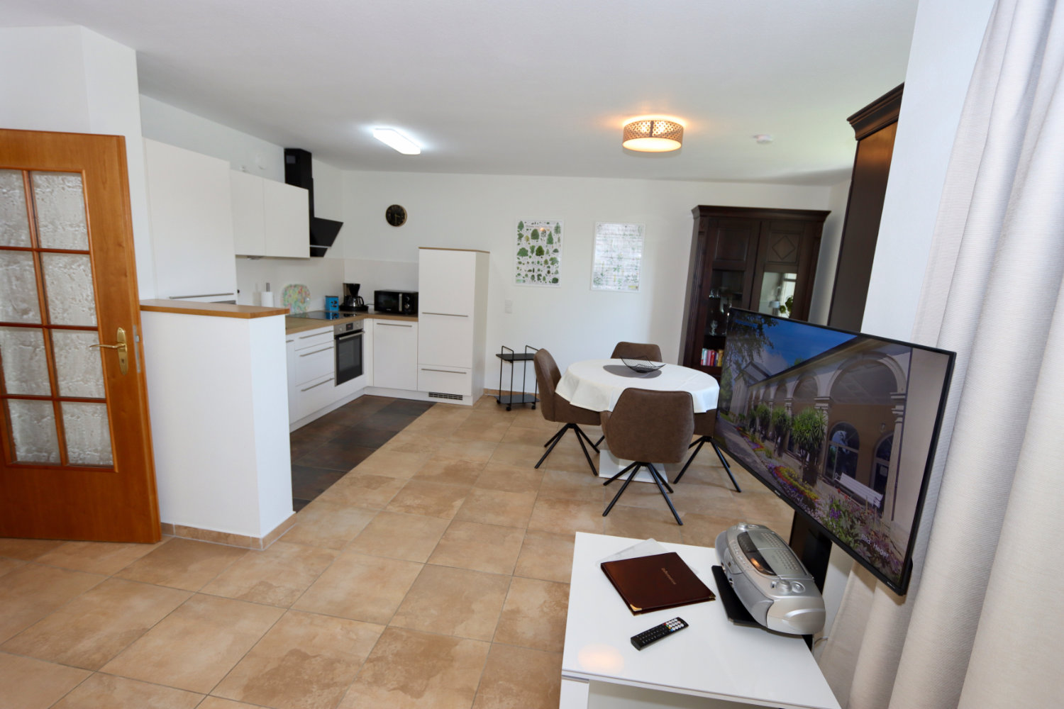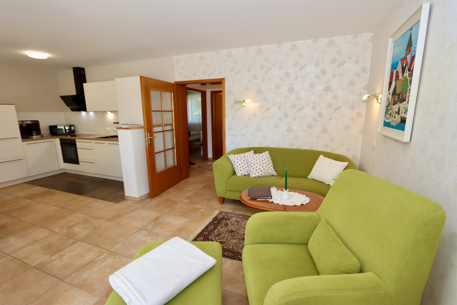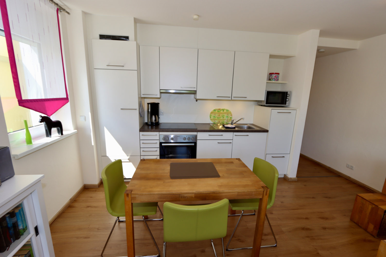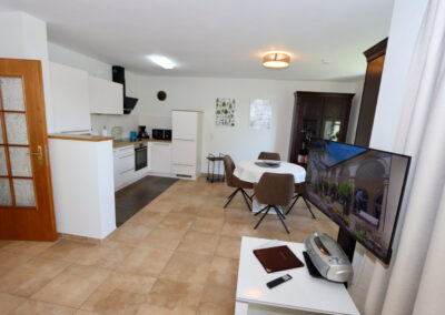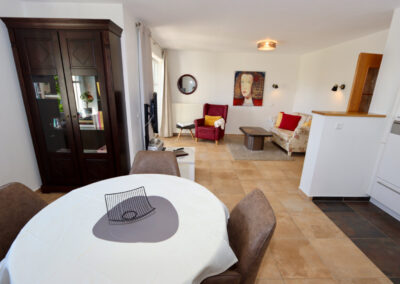 Wohn- und Esszimmer mit Küche inklusive ausgestatteter Küchenzeile inkl. Geschirrspüler, Mikrowelle, Kaffeemaschine und Wasserkocher